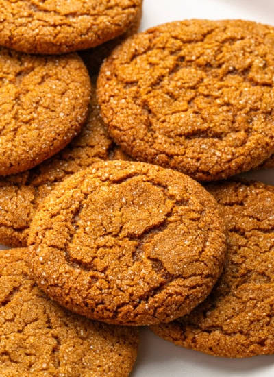 These Gingersnap Cookies are everything you want in a ginger-molasses cookie: crisp edges, chewy centers, and plenty of warm spice from ground ginger and cinnamon. The cookie dough comes together quickly with simple ingredients like butter, brown sugar, and molasses, and bakes in just minutes. They’re the perfect cookie recipe to keep on repeat all season, and store great in an airtight container if you somehow have leftovers.