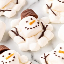 These Melted Marshmallow Snowman are ready to take a cocoa bath! Make this simple wintery treat and let him “melt” into warm cocoa. Perfect for Christmas parties or snow day treats.