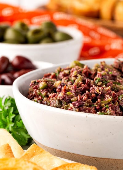 This Olive Tapenade Recipe is a bold, savory Mediterranean spread made with briny olives, capers, garlic, and fresh herbs blended into a rich, flavorful paste. It’s the perfect appetizer for charcuterie boards, crostini, sandwiches, or simple snacking with crackers and veggies.
